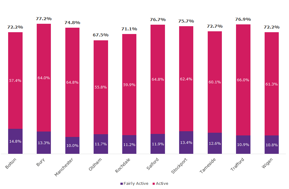 There also remains clear differences between the boroughs; there is a difference of 9.7% between the most active borough, Bury, and the least active, Oldham.