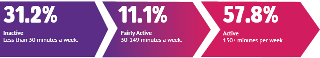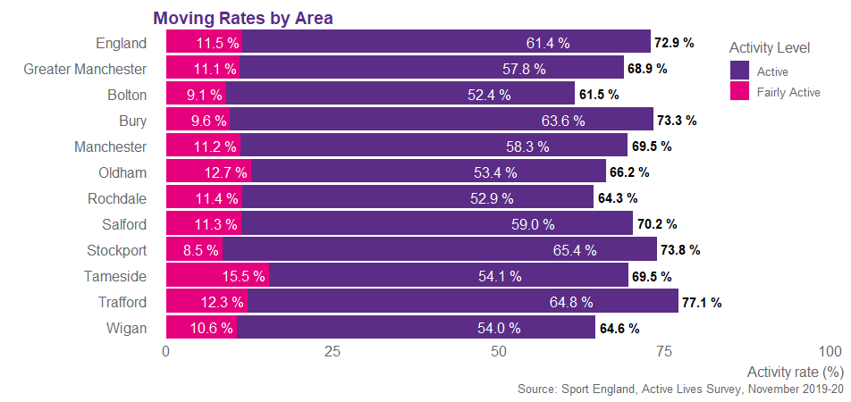 The latest Active Lives data shows that there has been a decline in activity levels across Greater Manchester. 68.9% of adults in Greater Manchester are now moving (active and fairly active), this equates to 1,551,900 adults, in comparison 72.9% of adults are moving nationally. In the past 12 months the moving rate has declined by 4.9% in Greater Manchester.
