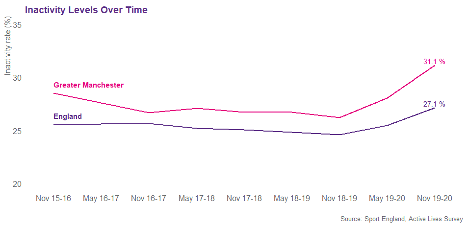 Since Active Lives launched, November 2015-16, the inactivity rate has increased by 2.6%, meanwhile nationally there has been a 1.6% increase. This widening of the inactivity gap, between Greater Manchester and England, has primarily been driven by changes in activity over the last 12 months, in Greater Manchester inactivity rates have increased at almost twice the national rate, 4.9% compared to 2.6%.