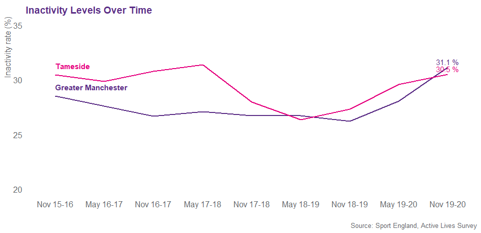 The latest Active Lives data shows that there has been a decline in activity levels across Tameside in the last 12 months. 69.5% of adults in Tameside are now moving (active and fairly active), this equates to 125,600 adults. Since Active Lives launched, November 2015-16, the inactivity rate has remained static, meanwhile in Greater Manchester the rate has increased by 2.6%.