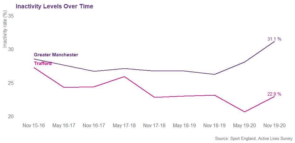 EthnicityDue to limited sample sizes we have limited ethnicity data across the Greater Manchester boroughs. In Trafford 21.4% of those from a White British background are inactive. |