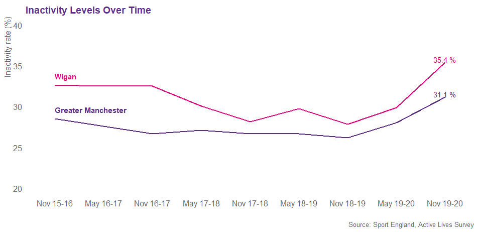 The latest Active Lives data shows that there has been a significant decline in activity levels across Wigan in the last 12 months. 64.6% of adults in Wigan are now moving (active and fairly active), this equates to 172,500 adults. Since Active Lives launched, November 2015-16, the inactivity rate has increased by 2.8%, meanwhile in Greater Manchester the rate has increased by 2.6%.