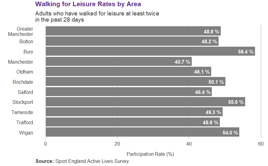 Walking for leisure rates are lowest in Manchester (40.7%), Bury once more has the highest participation rate (58.4%).