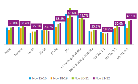 Most have recovered to baseline, except 16-34 years, NS SEC 3-5 and 6-8 groups. With only long-term health condition or disability and 35-54 years recovering to pre-pandemic.