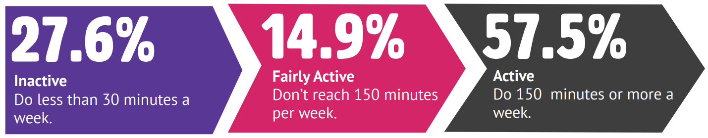 There are over a quarter of adults that are inactive (26.7%), which is above the GM and national averages, and equates to 41,700 adults in Bury. Further two fifth’s (42.5%) are not meeting the recommended amount of movement required to benefit their health, again above GM and national averages.