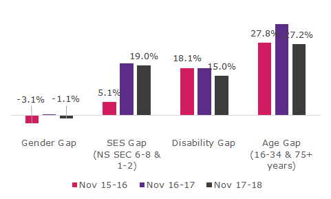 There are significant inequalities across people with a place. The gender, disability gap and age gaps have narrowed since Nov 15-16, but the socio-economic status (SES) has increased in Bury. Whereas the trend at GM level has seen the gender, age and disability gaps narrow, but the SES gap remain the same.