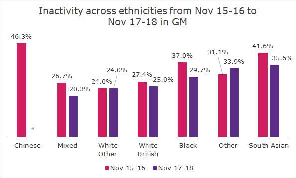 The trend across ethnicities is that inactivity has dropped for all ethnicities from 2015-16 to 2017-18, except White Other in GM. But more so for Black (-7.3%), Mixed (-6.4%) and South Asian (-6%) ethnicities, compared to White British (-2.4%). Compared to the national average inactivity across ethnicities has decreased by more for White British (-4.4%), similar for Mixed (-6.2%), much less for Black (-2.4%) and actually increased by almost double for South Asian (+11.3%) ethnicities.