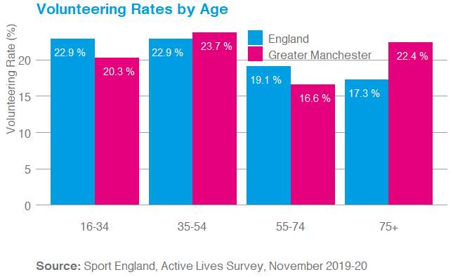 Whilst nationally volunteering to support sport and physical activity declines with age the pattern is not as clear in Greater Manchester. 35 to 54 year olds are the most likely to volunteer (23.7%) followed by over 75’s (22.4%); the volunteering rate amongst over 75’s is considerably higher in GM than it is nationally (22.4% v 17.3%).