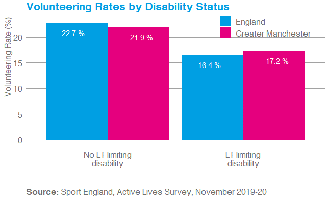 Volunteering rates are lower amongst those with a long term limiting disability, however, Greater Manchester does see an above average rate of volunteering amongst this cohort (17.2% v 16.4%). This, and lower than average volunteering rates for those with no long term limiting disability, means that GM has a smaller disability volunteering gap than seen nationally (4.7% v 6.3%).