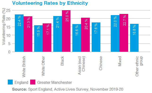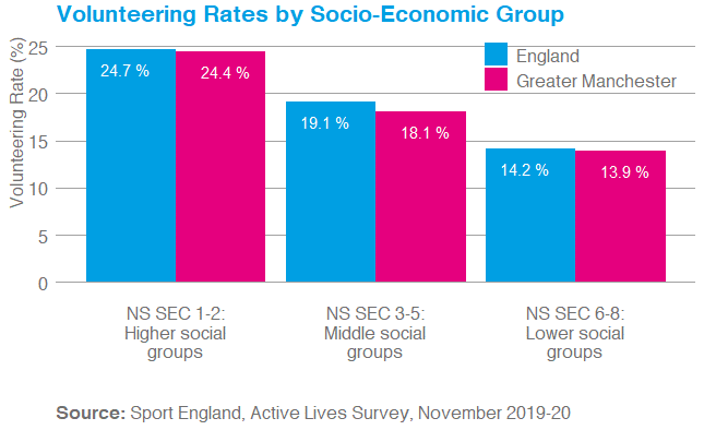 There is a clear relationship between socio-economic status and volunteering; those from higher socio-economic groups are more likely to volunteer and this pattern is seen both nationally and in Greater Manchester.
