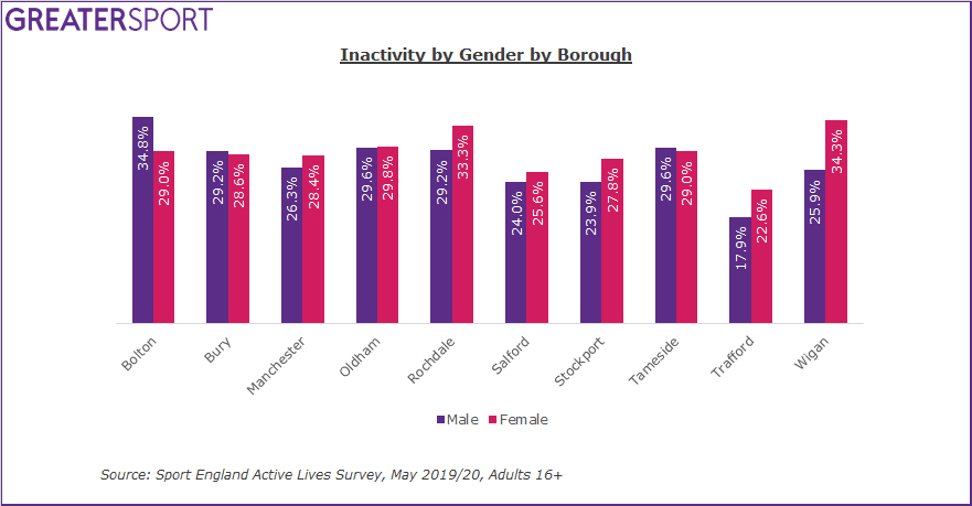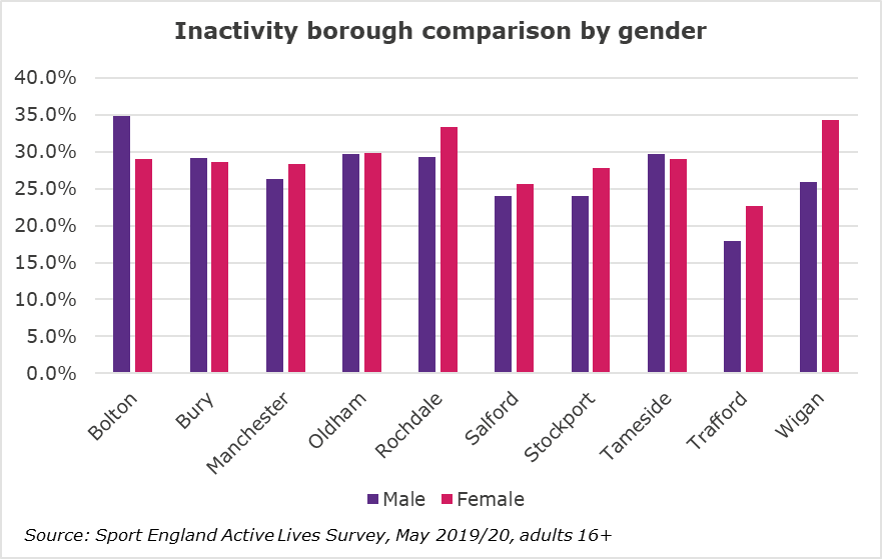 In most cases, men have lower levels of inactivity than women, however across Greater Manchester’s boroughs three of ten, Bolton, Bury and Tameside, have higher levels of male inactivity than female.