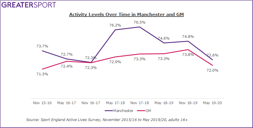 The latest Active Lives Release, May 2019/20, has seen an increase (2.1%) in the inactive population in Manchester in the last 12 months. Manchester has seen the percentage of people moving, active for at least 30 minutes a week, decrease by 1.1% since Active Lives began (November 2015/16) in comparison Greater Manchester as a whole has increased the moving population by 0.5% in the same time period.