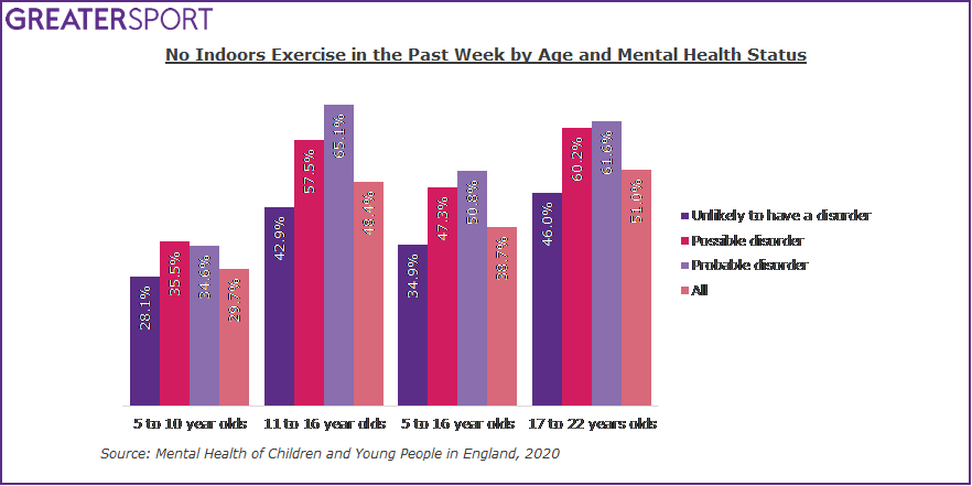 Whilst the disparity between those unlikely to have a disorder and those with probable disorder is not as profound when it comes to indoors exercise there is still a clear difference amongst older children and young people. The gap varies from 6.5% amongst 5 to 10 year old and rises to 22.2% amongst 11 to 16 year olds.