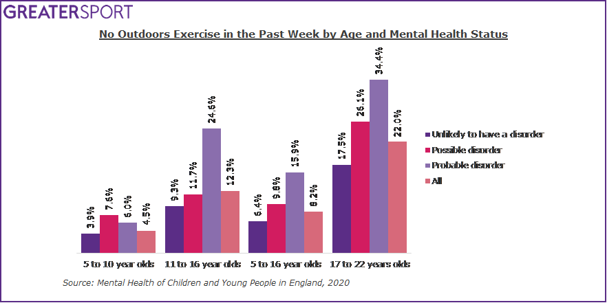 What is particularly concerning is the differences in activity levels amongst those believed to have a mental disorder and those without, particularly amongst older children and young people. Amongst 11 to 16 year olds and 17 to 22 year olds those with a probable mental disorder are approximately twice as likely to have not partaken in any outdoors exercise; 2.10 and 1.97 times respectively.