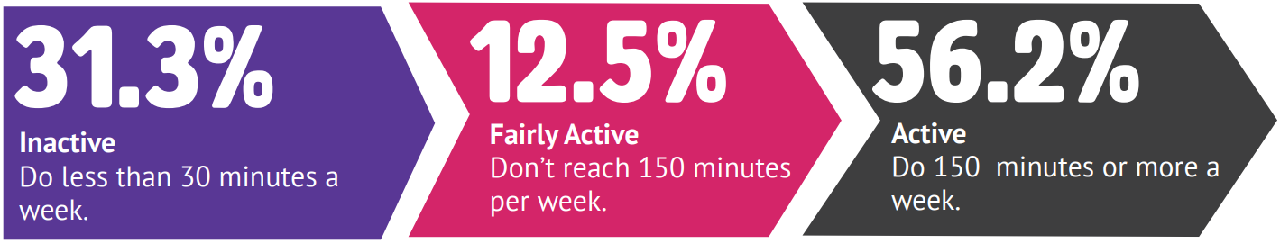 But there are nearly a third of adults that are inactive (31.3%), which is above the GM and national averages, and equates to 53,800 adults in Rochdale. Further over two fith’s (43.8%) are not meeting the recommended amount of movement required to benefit their health, again above GM and national averages.