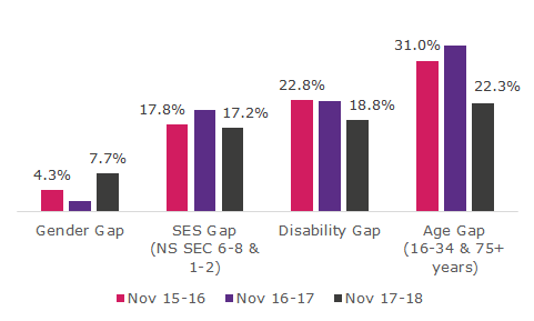 There are significant inequalities across people with a place. The disability and age gaps have narrowed, as has the socio-economic status (SES) gap slightly, but the gender gap has increased in Rochdale. Whereas the trend at GM level has seen the gender, age and disability gaps narrow, but the SES gap remain the same.