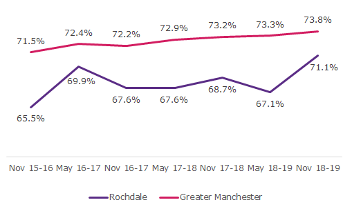 These results continue the positive trend in Rochdale, with the proportion of the adult population who are moving now being at its highest level. There has been an increase of 5.6% in the number of adults moving (active and fairly active) since Active Lives launched in November 2015-16, this is a greater increase than both England (1.0%) and Greater Manchester (2.3%).