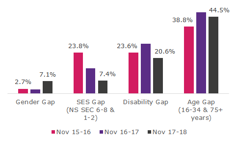 There are significant inequalities across people with a place. The socio-economic status (SES) and disability gaps have narrowed but the gender and age gaps have increased in Salford. Whereas the trend at GM level has seen the gender, age and disability gaps narrow, but the SES gap remain the same.