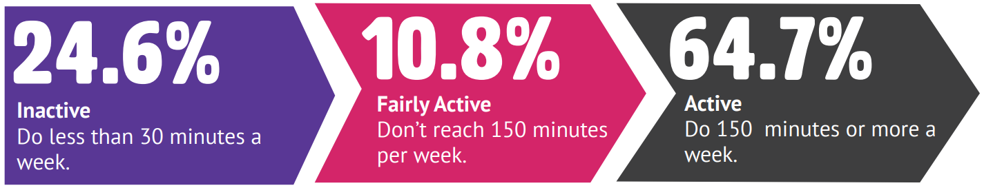 But there are nearly a quarter of adults that are inactive (24.6%), although below the GM and national averages, and equates to 57,700 adults in Stockport. Further nearly two fith’s (35.4%) are not meeting the recommended amount of movement required to benefit their health, again above GM and national averages.