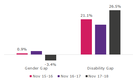 There are significant inequalities across people with a place. The gender and disability gaps have increased, whilst there