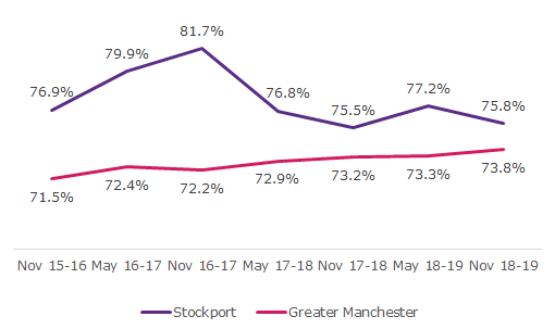 The latest results continue the negative average trend in Stockport where there has been a decrease of 1.1% in the number of adults moving (active and fairly active) since Active Lives began in November 2015-16. However, it remains above the Greater Manchester level of moving.