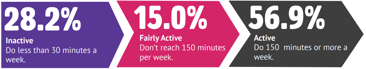 But there are over a quarter of adults that are inactive (28.2%), which is above the GM and national averages, and equates to 74,300 adults in Wigan. Further over two fith’s (43.2%) are not meeting the recommended amount of movement required to benefit their health, again above GM and national averages.