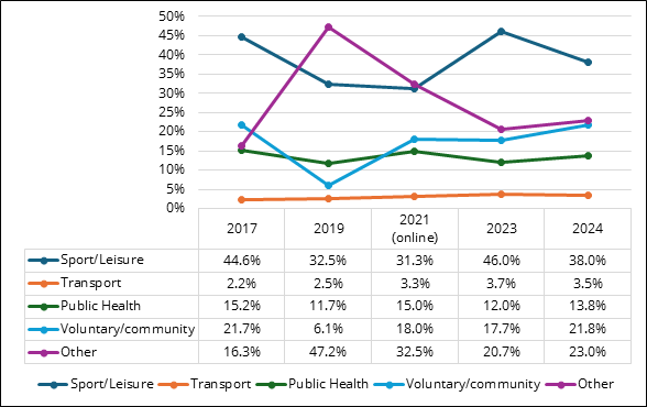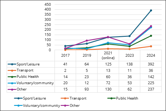 Figure 36 illustrates how the counts of the sign ups at the GM Moving conference have varied over the years by sector. Broadly speaking, there has been an increase across all areas, which is a positive, reinforced by the overall high sign up count mentioned in the previous section. The most rises in comparison to last year’s data can be seen in the sport and leisure sector, with a 184% increase in the number of signups (392 in 2024). Public Health and the Voluntary/community sectors also saw significant increases in numbers, both hitting triple figures in sign up numbers this year for the first time. The one area that seems to stand out the most in terms of signups is Transport, with significantly less representation than the other categories. There may be a topic to explore in terms of the lack of signups from individuals within that sector, and how more of those relationships can be formed.