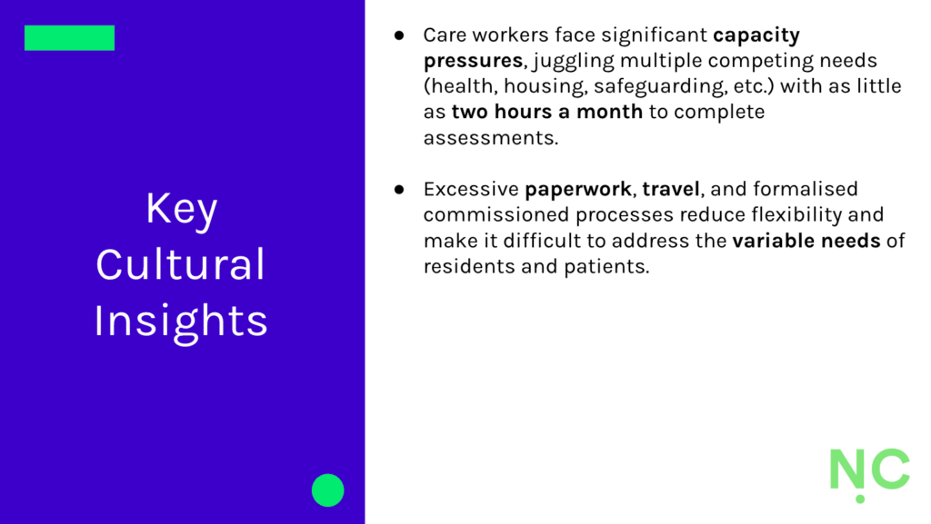 Using Noisy Cricket’s systemic lens, we determined the interconnections between those impacting, influencing and impacting the sector, and the structural, cultural and personal influences on physical activity and movement in social care. We also explored the role the workforce does (or might) play in enabling it. What quickly became clear was the power of local government commissioning and social care provider approaches to influence how physical activity and movement might be integrated into care provision.